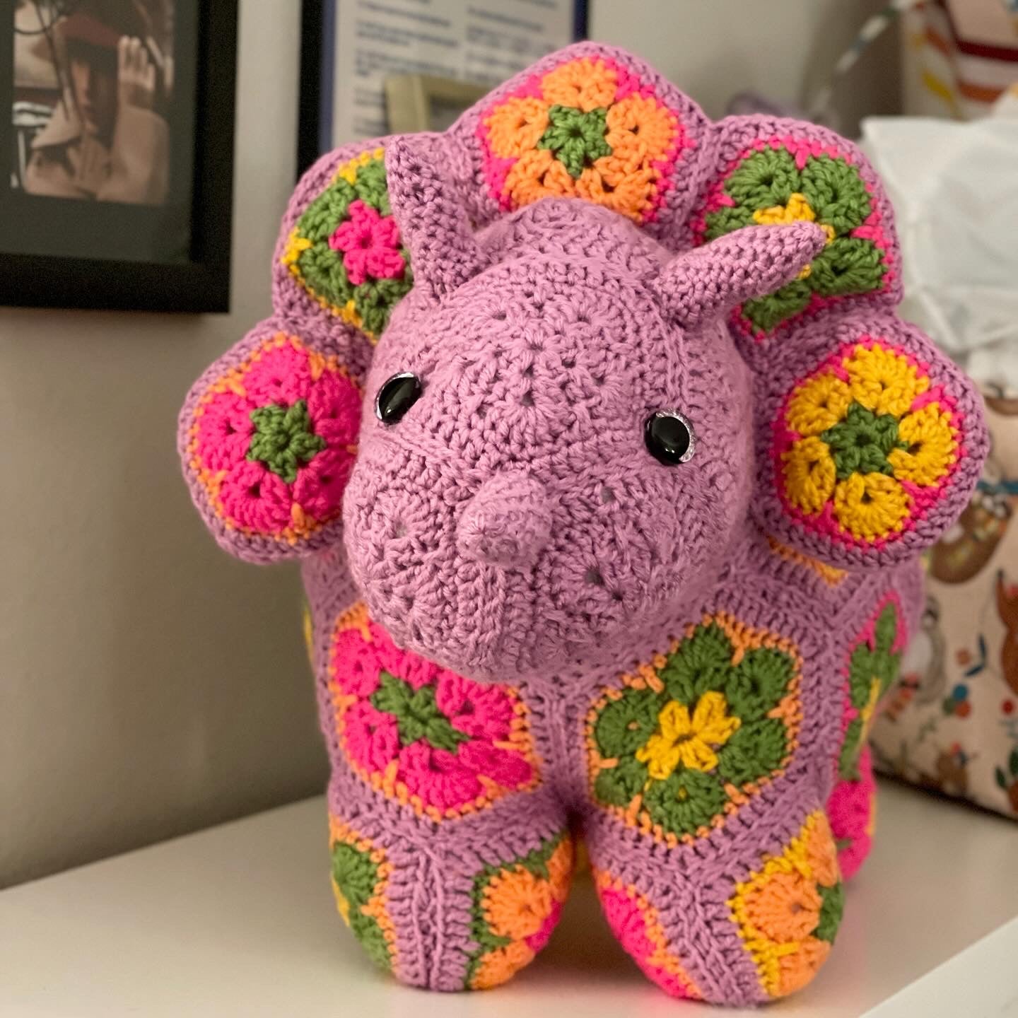 My African flower triceratops is easily my favorite plushie I’ve made to date. When I began this project, I didn’t have much faith in my abilities as a crochet artist. As each piece was finished and she started to take shape, it taught me to be more confident in my true ability as a crochet artist. This beautiful creation is a constant reminder that I shouldn’t doubt myself or my abilities.